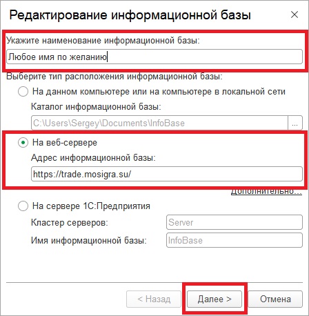3. «Добавление в список существующей информационной базы» —> «Далее»